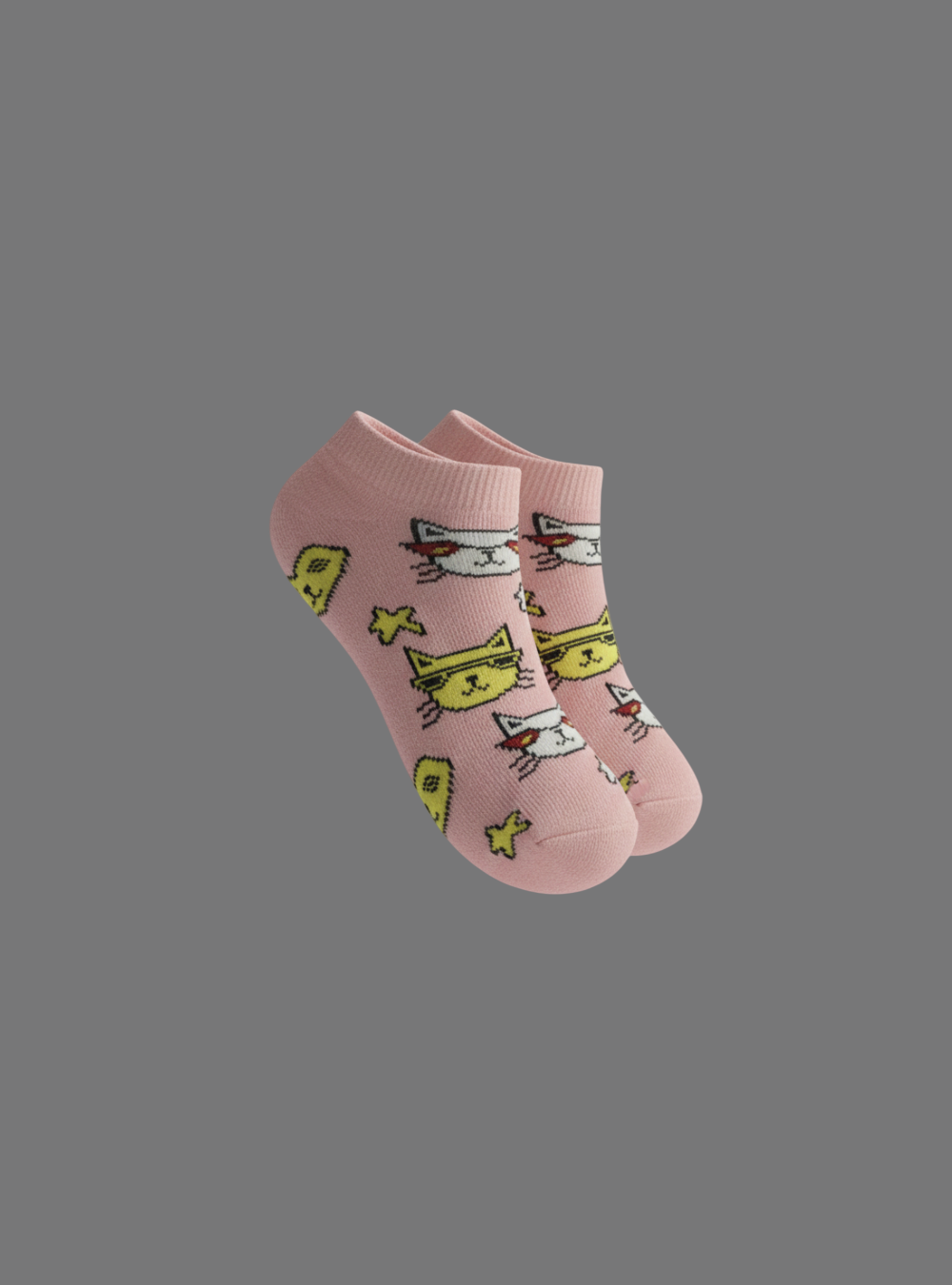 This is a pair of pink ankle socks with a cartoon cat design.