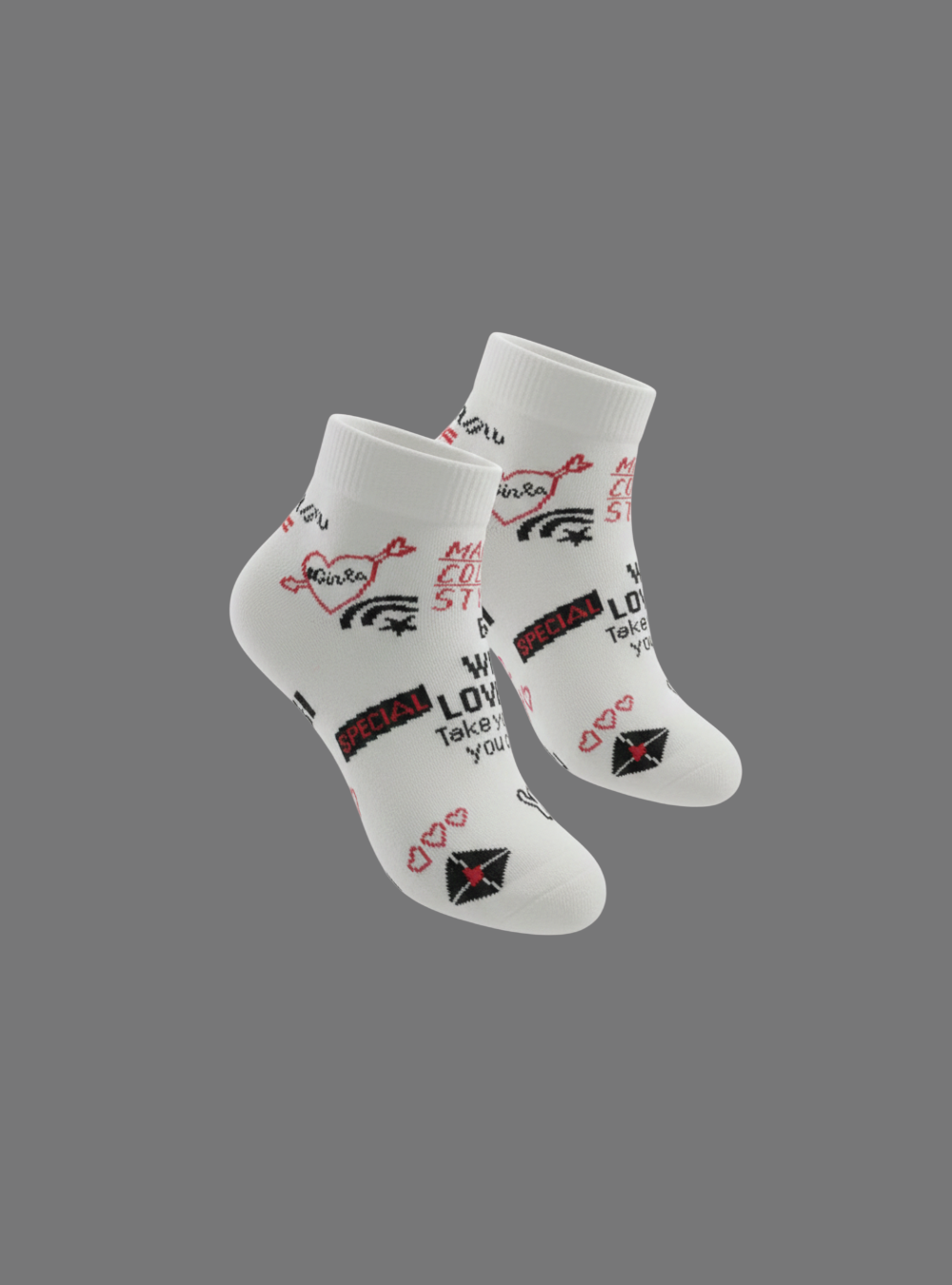 This is a pair of white ankle socks with a dog graphic and text details.