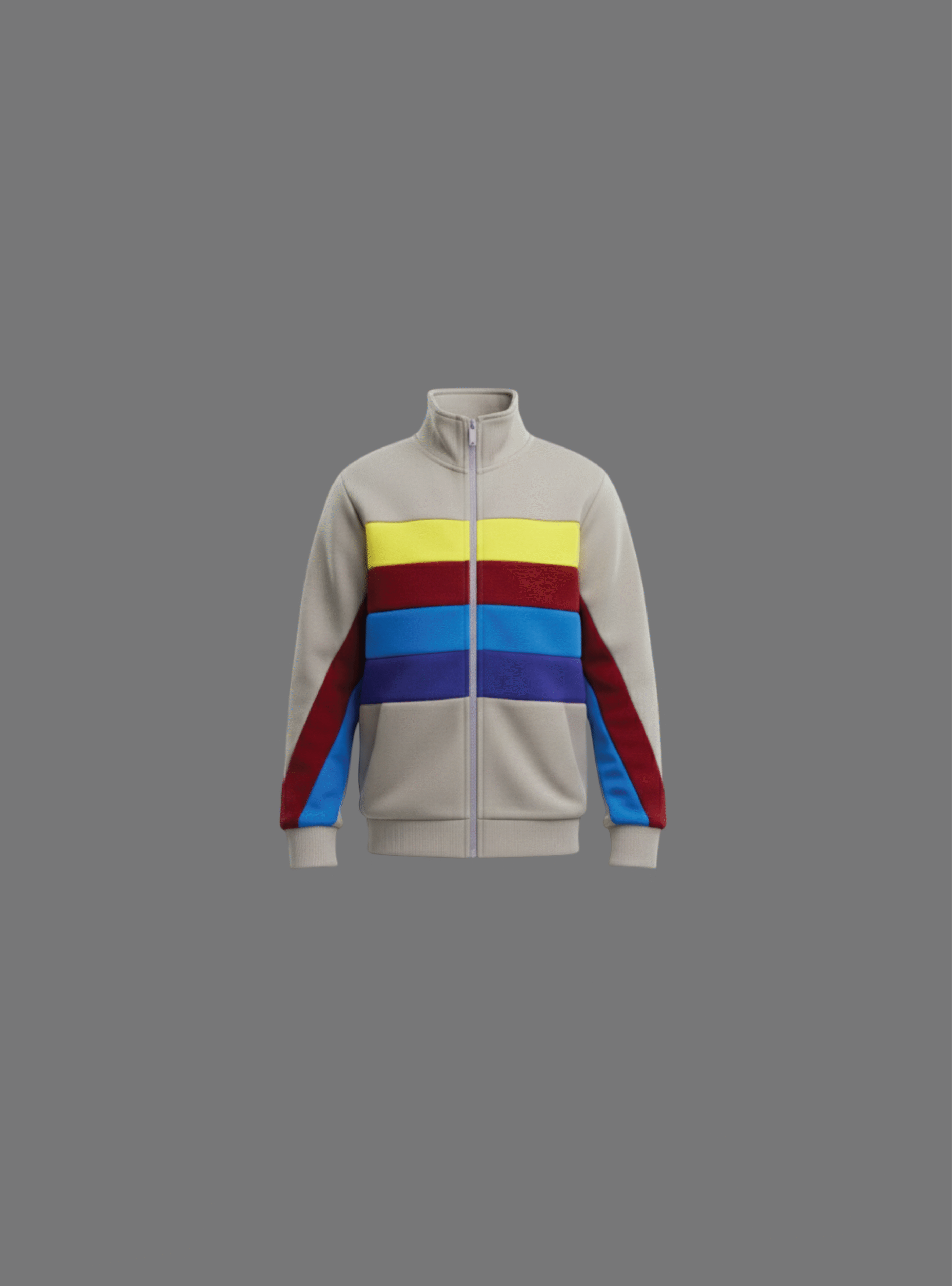 The jacket in the image appears to be a multi-color block track jacket style.