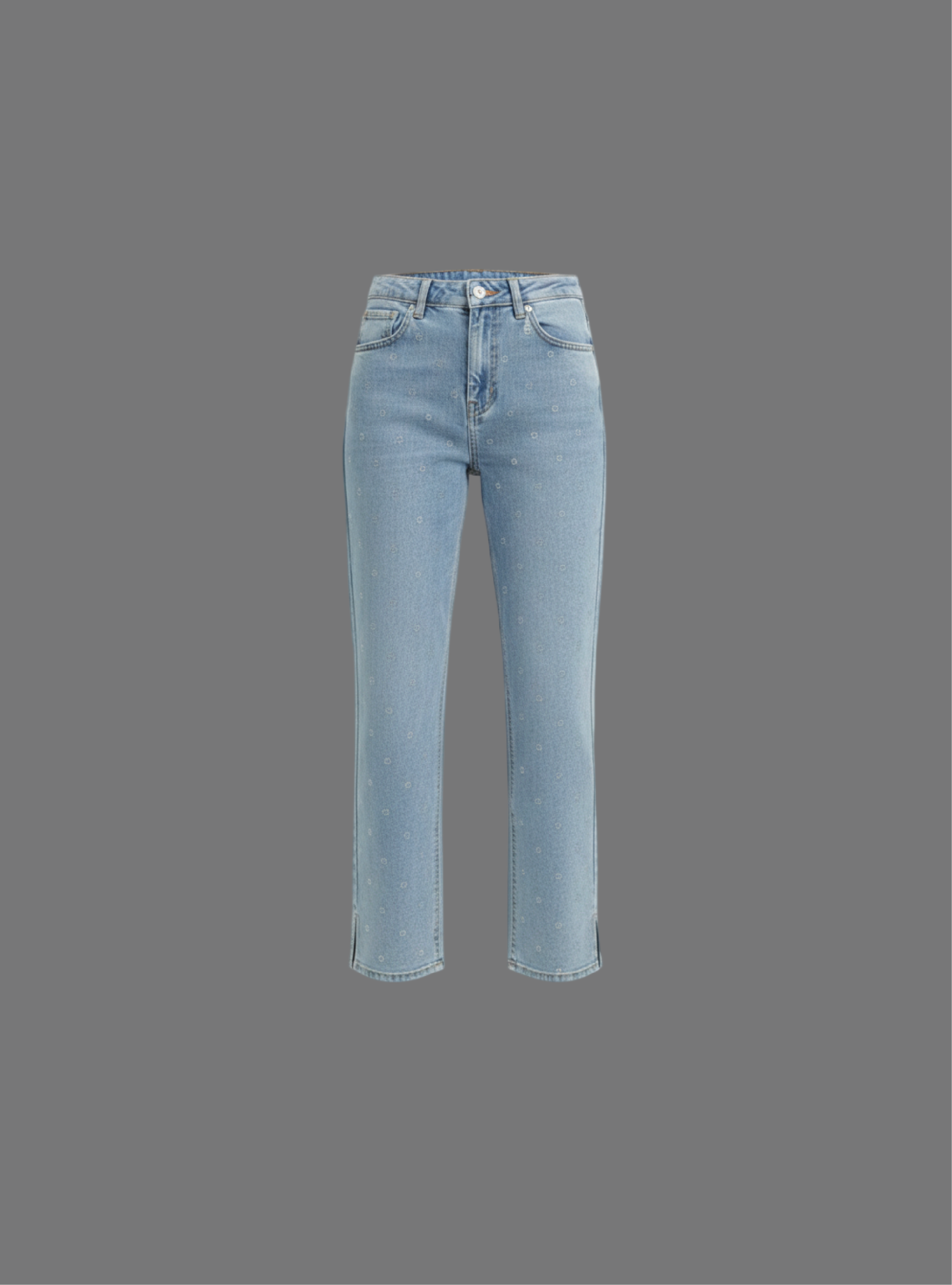 Embellishment- The jeans are covered in a scattered pattern of small rhinestones or metallic studs & Attached Button & Fly Zipper.